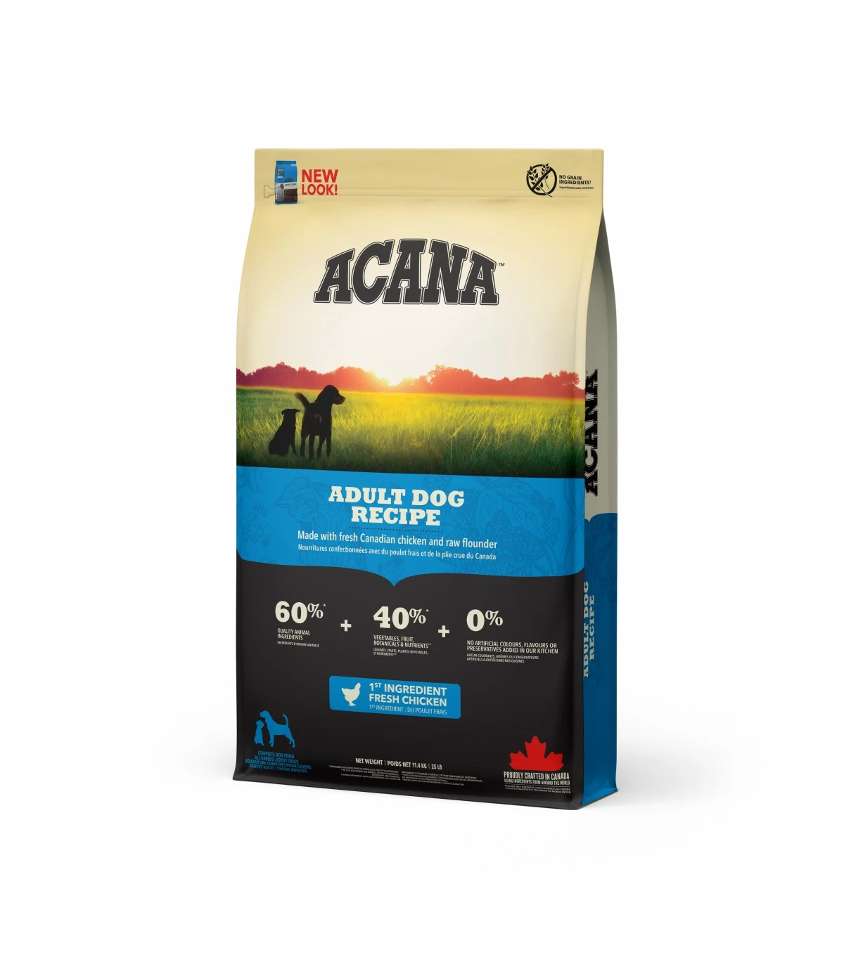 Il cane discende dal lupo grigio e richiede quindi la stessa alimentazione ricca di proteine del suo antenato per mantenersi in salute. ACANA Adult Dog Recipe include pollo, passera del Pacifico pescata in natura e uova, consegnati ogni giorno freschi o crudi presso le nostre cucine, fornendo in modo naturale tutti i nutrienti necessari per mantenere il cane forte e in salute.