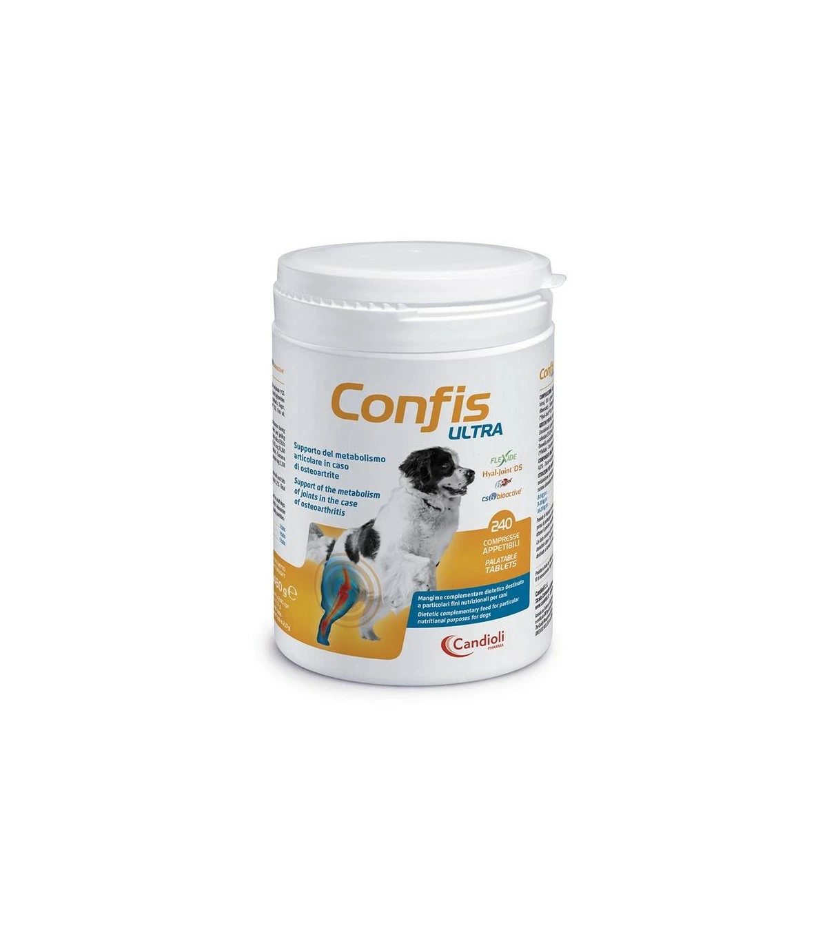 Confis Ultra è un mangime complementare dietetico per cani, formulato per il supporto del metabolismo articolare in caso di osteoartrite.
