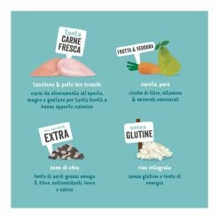Pollo fresco biologico* (25%), proteina di riso biologico*, riso integrale biologico*, miglio integrale biologico*, avena integrale biologica*, tacchino fresco biologico* (5%), minerali, sughetto di maiale biologico*, grasso di pollo biologico*, pomodori biologici* (0,04%), carote biologiche* (0,04%), pere biologiche* (0,04%), mele biologiche* (0,04%), semi di chia biologica* (0,04%), cocco biologico* (0,04%), ortica biologica*, foglie di rovo biologico*, finocchio biologico*, cumino dei prati biologico*, camomilla biologica*, melissa biologica*.