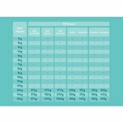 Vedi tabelle nelle immagini. Troverai indicazioni di dosaggio per cuccioli da 0 a 12 mesi d’età.
