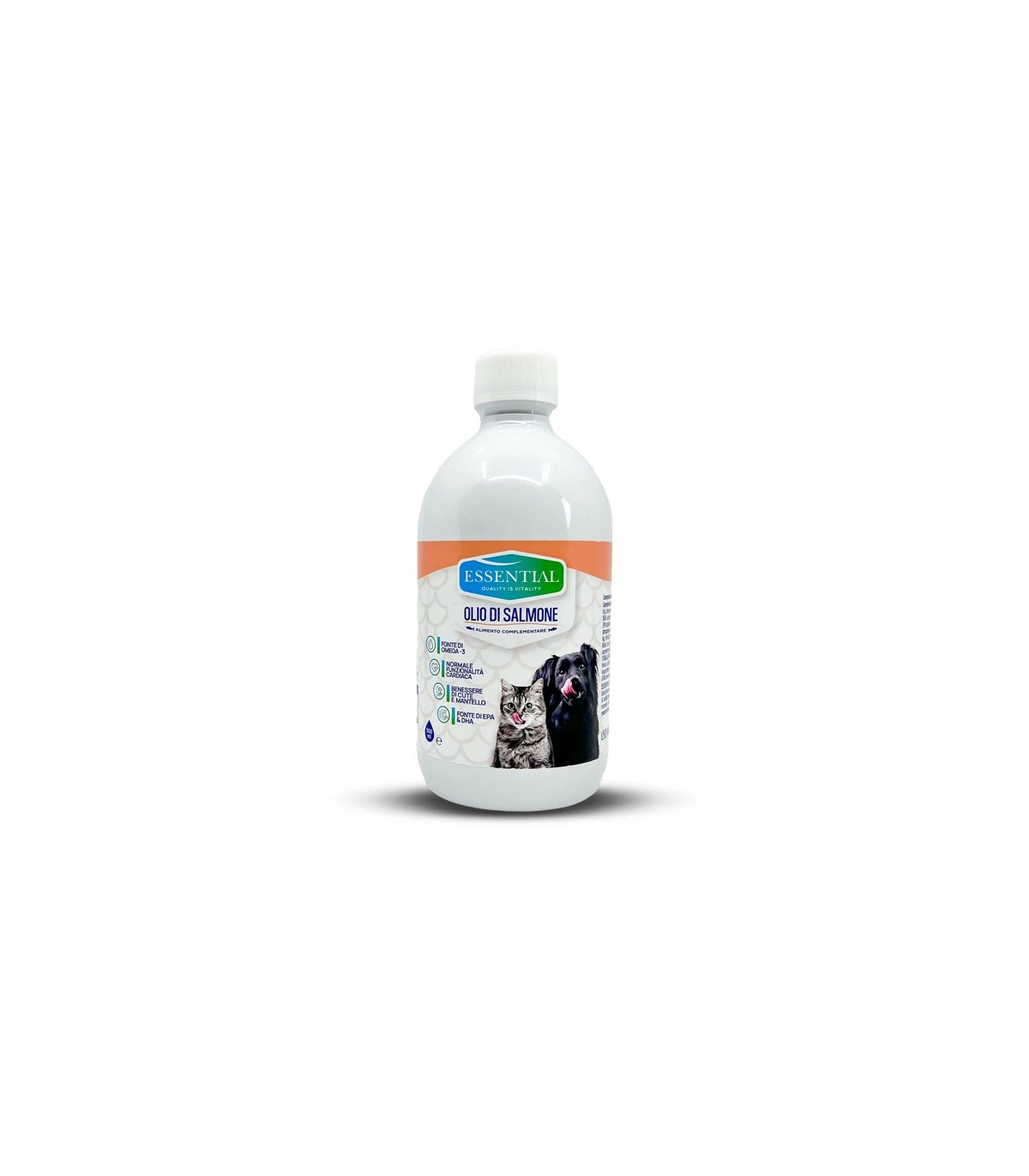 ESSENTIAL Olio di Salmone è un alimento complementare ideale come arricchimento nell’alimentazione del cane e del gatto. È naturalmente ricco di acidi grassi Omega 3, nutrienti utili al benessere dell’organismo, al normale funzionamento del sistema immunitario e preziosi per un manto lucente e per il benessere della cute.