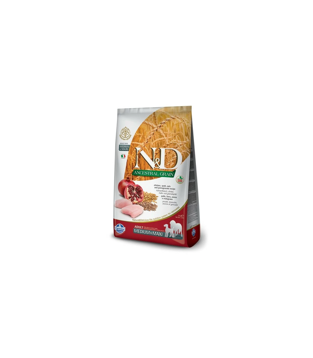 Farmina n&d low grain cane medium & maxi farro avena pollo e melograno 12 kg è un alimento completo per cani adulti a base di farro, avena, pollo, melograno
