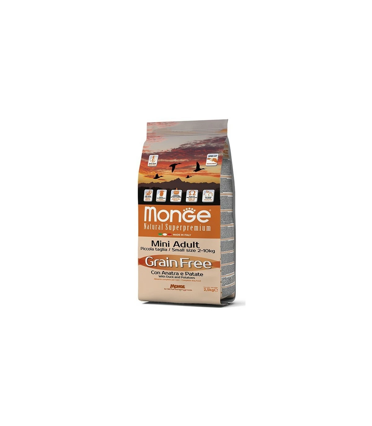 Altamente digeribile e appetibile, Grain Free Mini Adult con Anatra e Patate è un alimento con un elevato valore proteico.