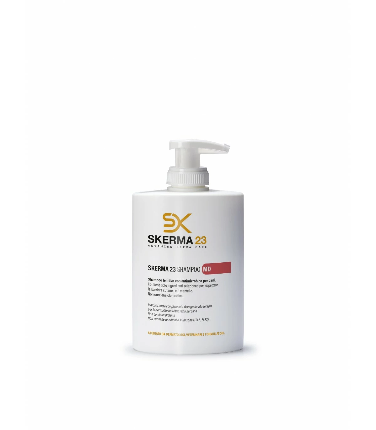 Lo shampoo SKERMA 23 MD è una formulazione detergente leggermente schiumogena e facilmente risciacquabile. Contiene tensioattivi delicati e lipidi essenziali per la salute della barriera cutanea (Ceramide 2 e 3). La presenza di Climbazolo e Piroctone lo rendono particolarmente indicato nei casi di dismicrobismo cutaneo, inclusa la dermatite da Malassezia. In armonia con gli altri prodotti della linea SKERMA 23 non contiene sostanze potenzialmente irritanti o allergizzanti (profumi, estratti vegetali, conservanti o clorexidina). È indicato per qualunque tipo di cute e mantello, per un uso frequente, è consigliato in cani che seguono una terapia per la dermatite da Malassezia, è ideale nel caso in cui ci sia un’eccessiva proliferazione microbica ed in caso di cute sensibile o iper reattiva.