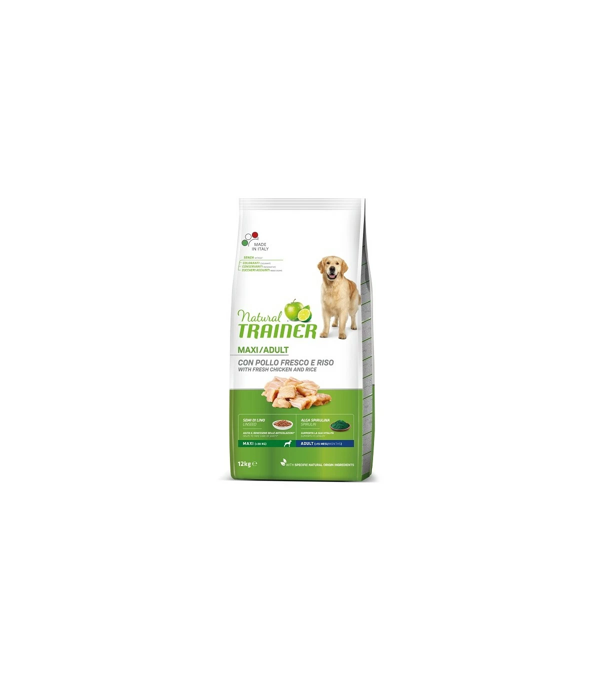 pollo fresco 18% , proteine disidratate di pollo e tacchino 18% , granturco , riso 12% , fioretto di granturco , proteine animali idrolizzate , grasso di origine animale , semi di lino* 2,5% , polpa di barbabietola* , proteina di granturco , sostanze minerali , lievito autolisato 0,75% , estratto secco di radice di cicoria (fonte di inulina)* , olio di granturco , lignocellulosa , mela disidratata in polvere* 0,15% , concentrato di limone in polvere* 0,1% , spirulina (Arthrospira platensis)* 0,1% , peptidi di collagene bioattivi 0,06%. , *Ingredienti di origine naturale specifica.