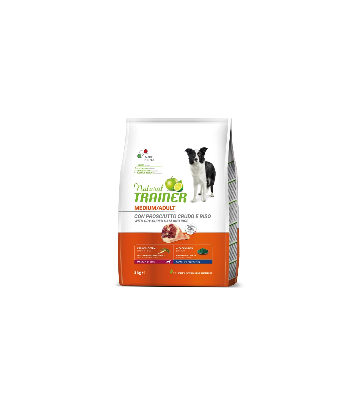 pollo fresco , granturco , proteine disidratate di pollo e tacchino , fioretto di granturco , riso 10% , proteine disidratate di prosciutto crudo 100% italiano 4,5% , grasso di origine animale , proteina di granturco , proteine animali idrolizzate , semi di lino* , polpa di barbabietola* 2% , lievito autolisato 0,75% , estratto secco di radice di cicoria (fonte di inulina)* 0,7% , olio di granturco , sostanze minerali , lignocellulosa , mela disidratata in polvere* 0,15% , concentrato di limone in polvere* 0,1% , spirulina (Arthrospira platensis)* 0,1%. , *Ingredienti di origine naturale specifica.