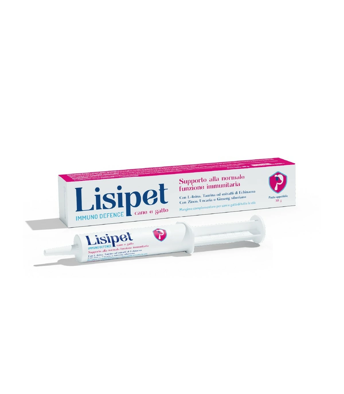 Lisipet pasta appetibile è un mangime complementare per cani e gatti di tutte le etĂ studiato come supporto alla normale funzione immunitaria. L-Lisina, Taurina e Zinco sono nutrienti essenziali del metabolismo dellâanimale, mentre gli estratti di Echinacea (Purpurea e Angustifolia), Ginseng siberiano (Eleuterococcus) e possono favorire le naturali difese dellâorganismo. Contiene proteine animali idrolizzate a basso peso molecolare. Adatto anche in regime di alimentazione controllata (diete monoproteiche) e a ridotto apporto di grassi.