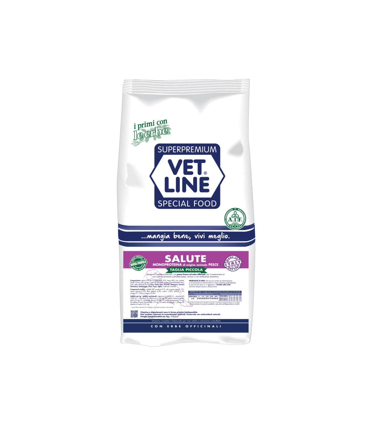 Mangime secco completo e bilanciato, con pesce fresco ed erbe officinali, per il mantenimento di cani adulti di piccola taglia, a nutrizione controllata (obesi, con intolleranze alimentari o similari). La formula Salute secco rappresenta la massima espressione del concetto ipoallergizzante sul mercato.